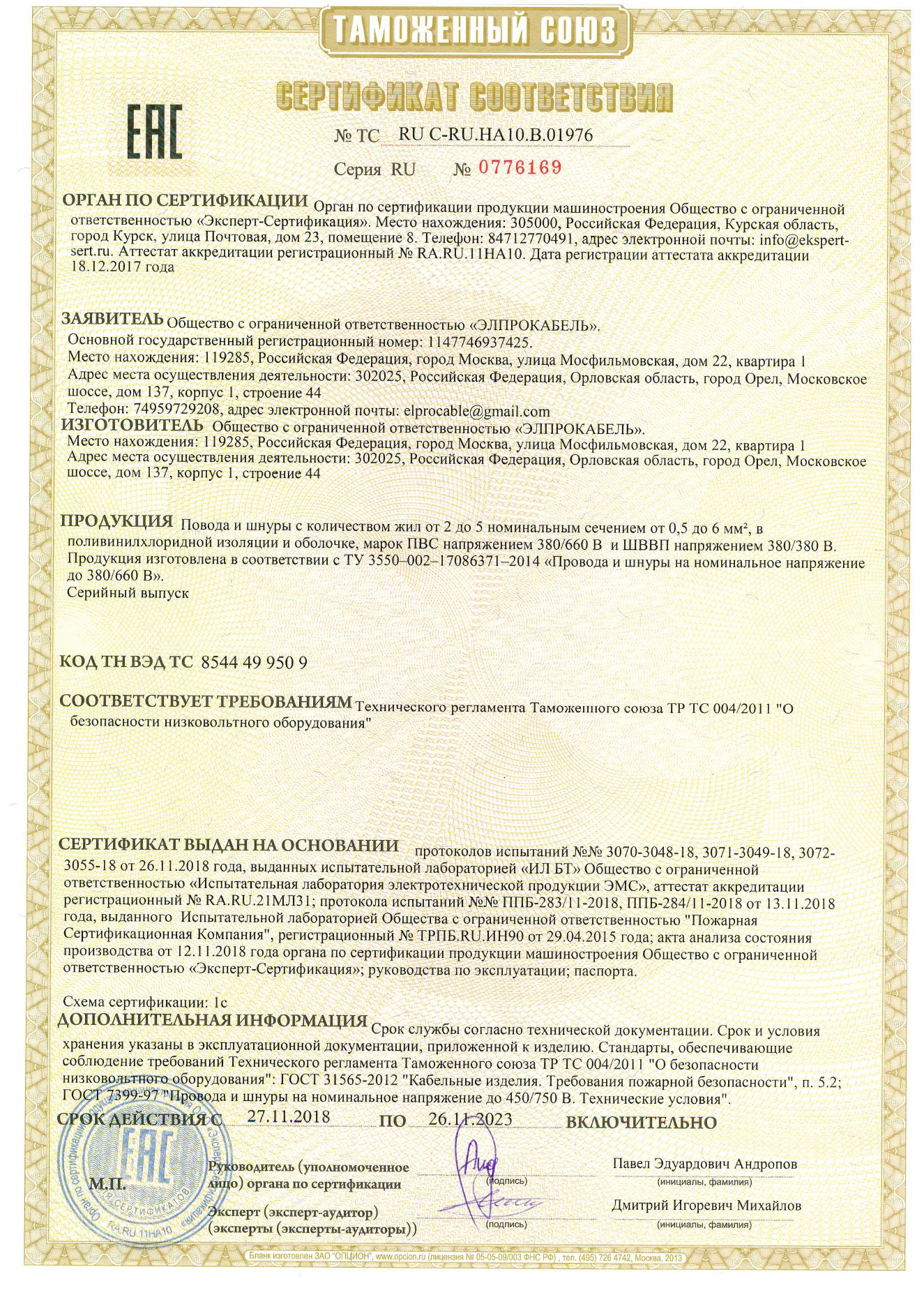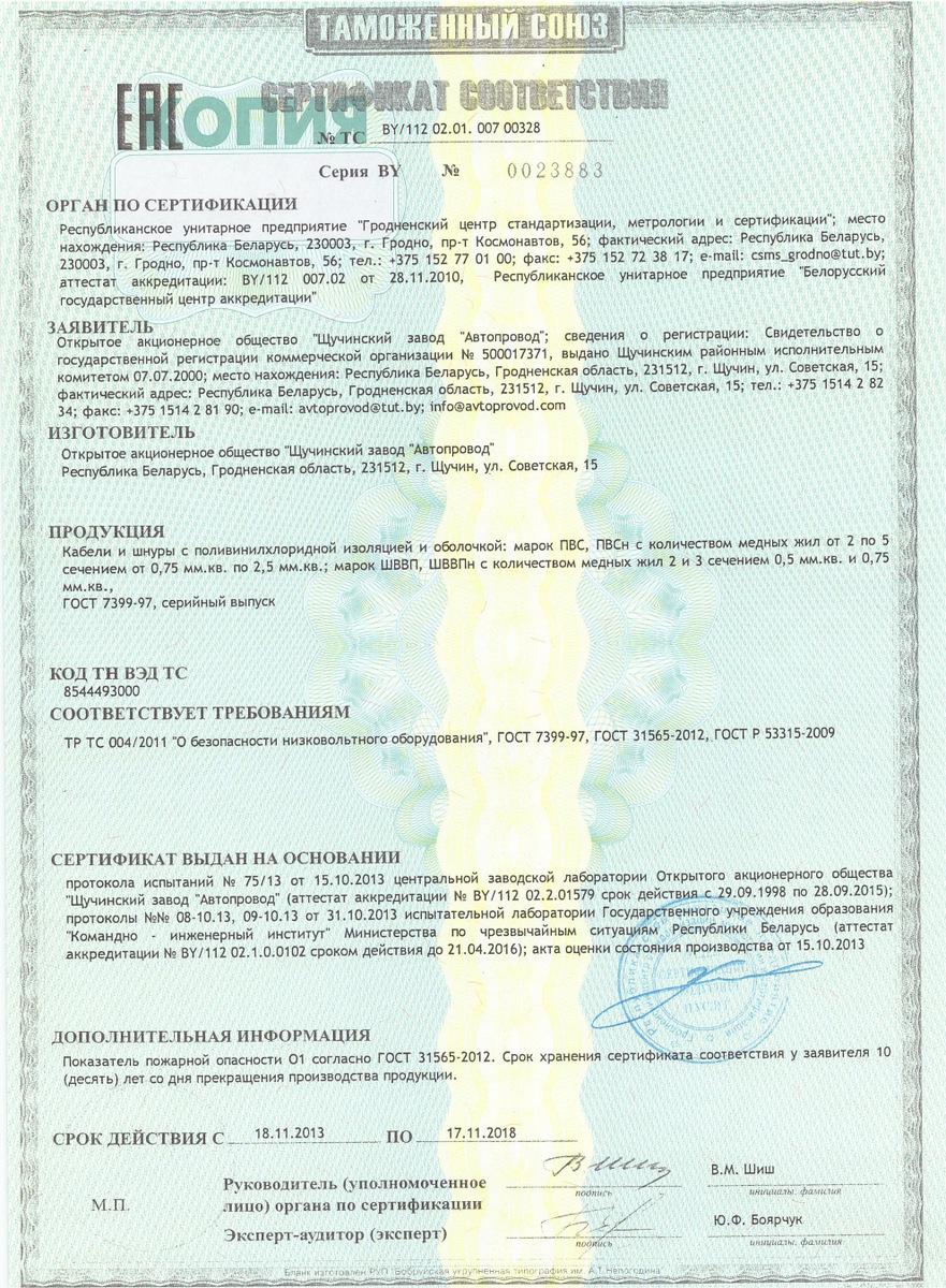 Сертификат Провод ШВВП 2х0,75 100м ГОСТ Falcon Eye