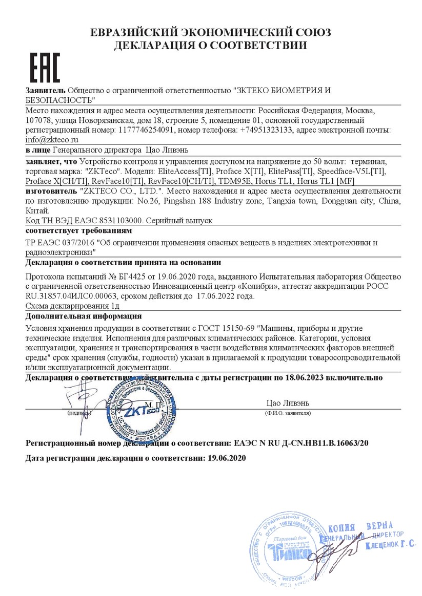 Сертификат SpeedFace-V5L [TI]